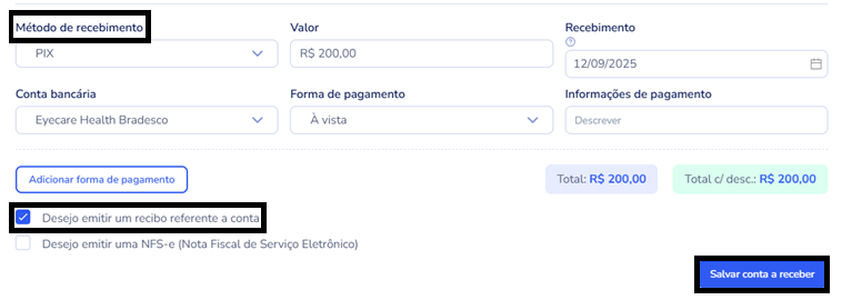 - Ao criar uma nova conta, selecione, ao final da página, a opção "Desejo emitir um recibo referente à conta".