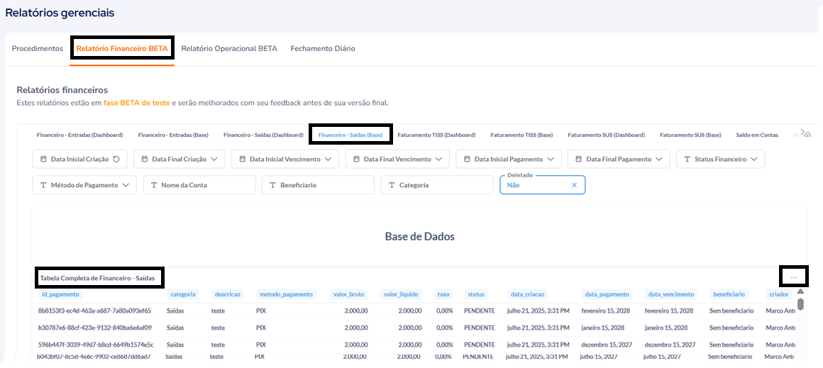 - Selecione "Relatório financeiro BETA", onde você encontrará as opções "Financeiro - Entrada" e "Financeiro - Saídas"
