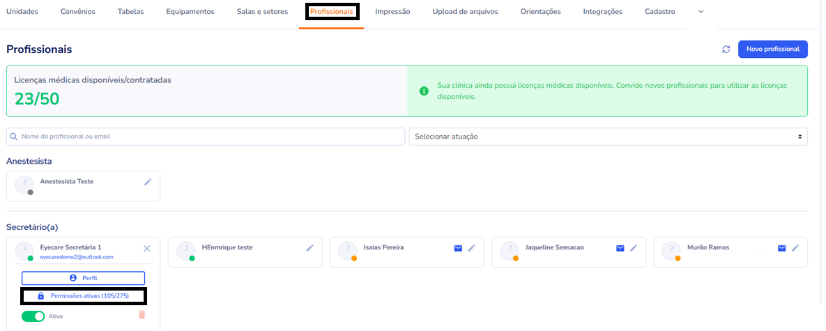 - Acesse configurações da clínica e selecione a opção "profissionais".