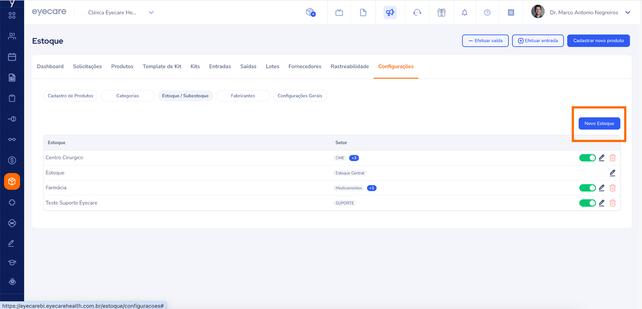 Onde fica: Menu → Estoque → Estoques/Setores.
