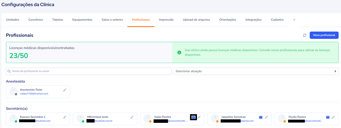 - Localize o nome do profissional desejado e clique no ícone de envelope ao lado. Assim, o e-mail de primeiro acesso será reenviado automaticamente.