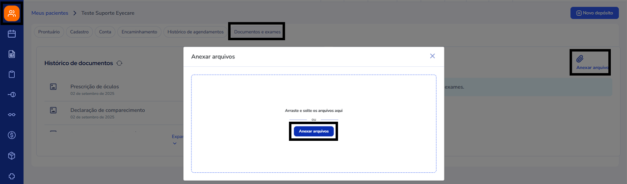 - Navegue até a seção "Documentos e Exames" e selecione a opção "Anexar arquivo" em histórico de Exames.