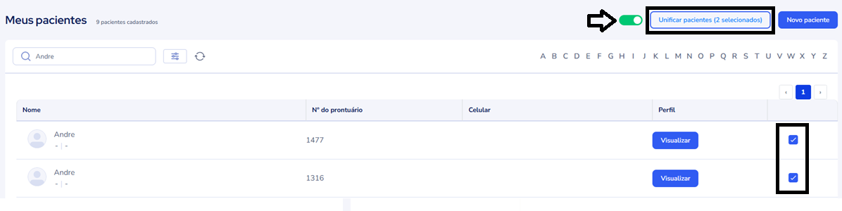 - Acesse a aba pacientes e ative o botão ao lado de unificar paciente.